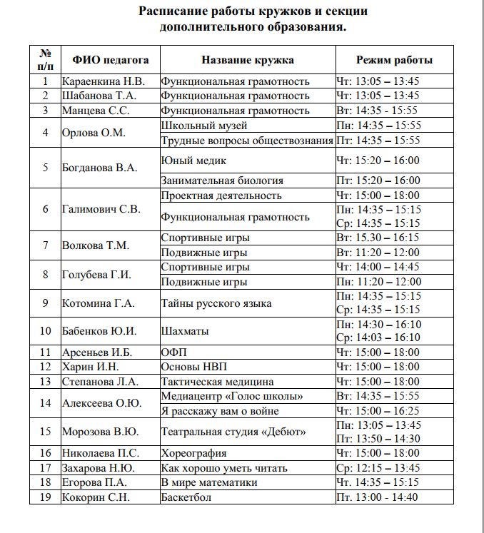 РАСПИСАНИЕ ВНЕУРОЧНОЙ ДЕЯТЕЛЬНОСТИ