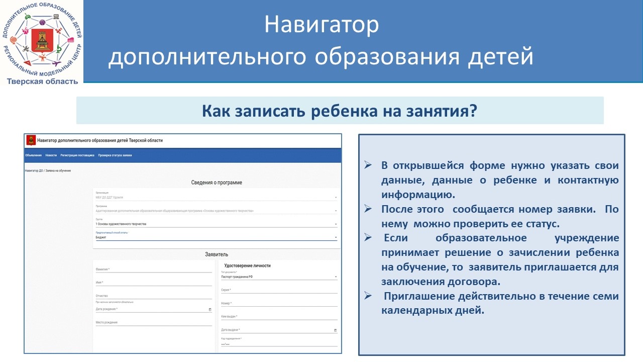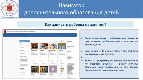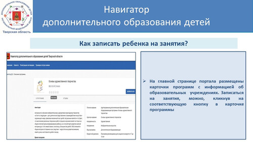 Напомним, в Тверской области работает электронный ресурс «Навигатор дополнительного образования детей Тверской области», где дети и их родители могут выбрать детские объединения и записаться в режиме онлайн. Об этом ресурсе мы рассказываем в карточках. Подробнее о навигаторе можно узнать на сайте https://ndo.tvobr.ru/