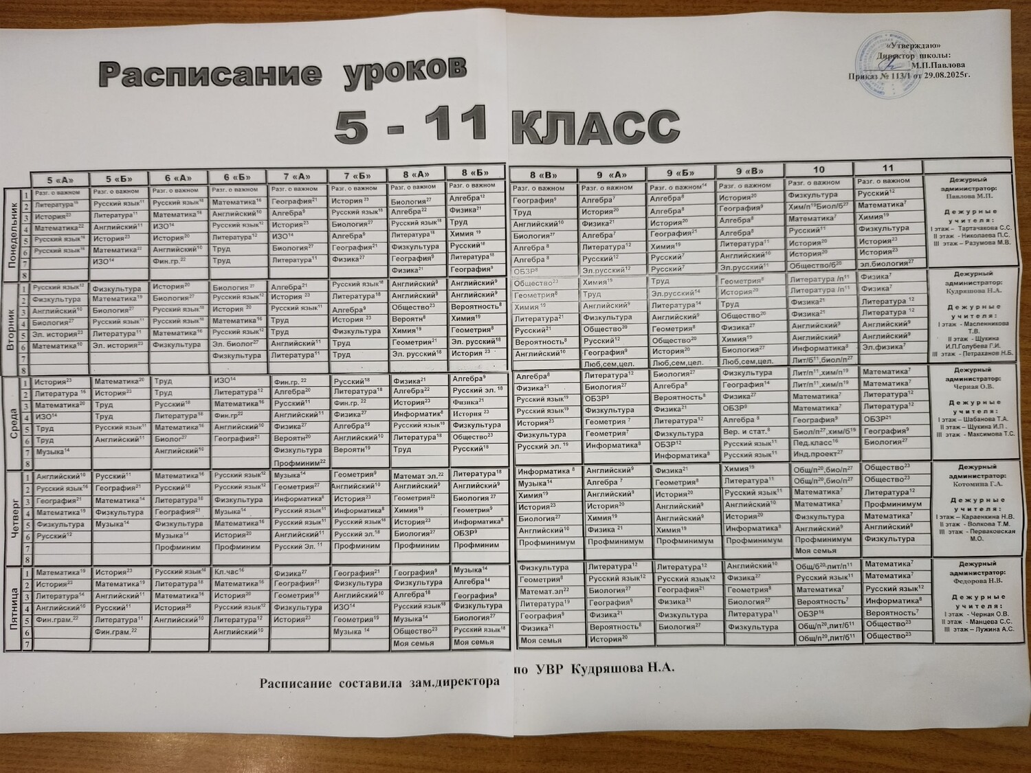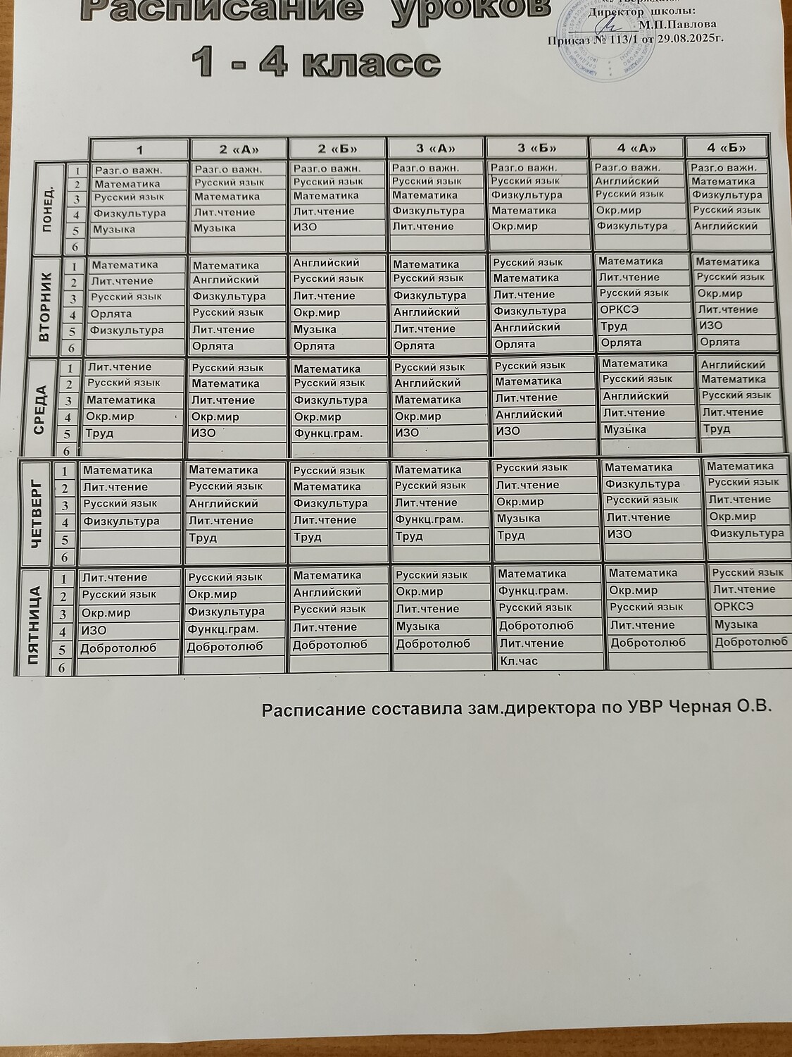 Расписание уроков на 2025-2026 учебный год