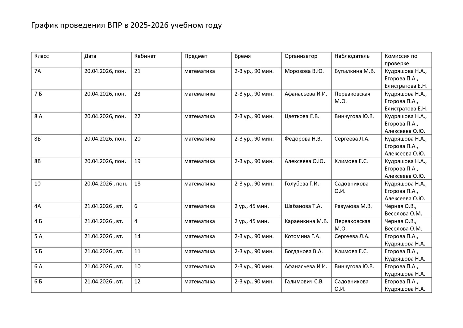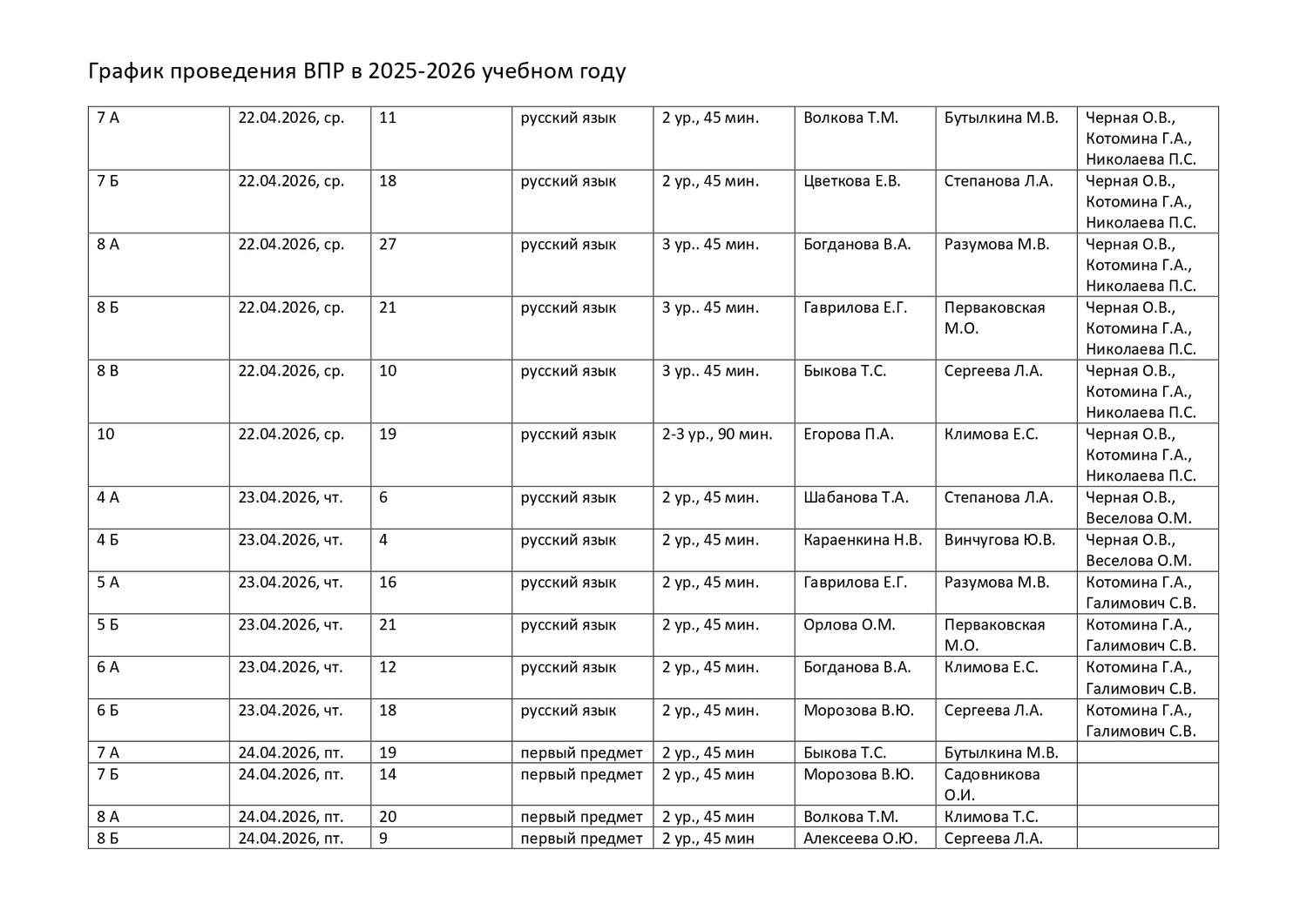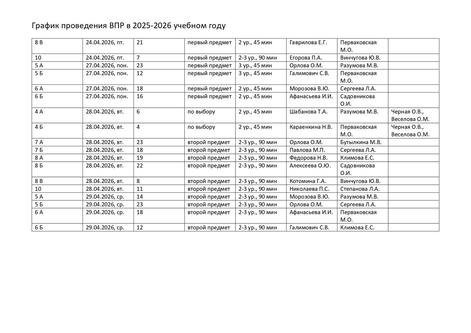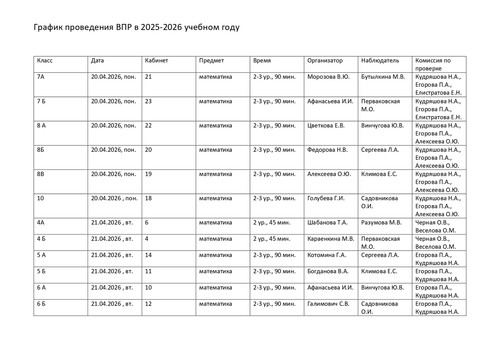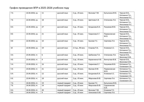 План-график проведения всероссийских проверочных работ в 2025/2026 учебном году
