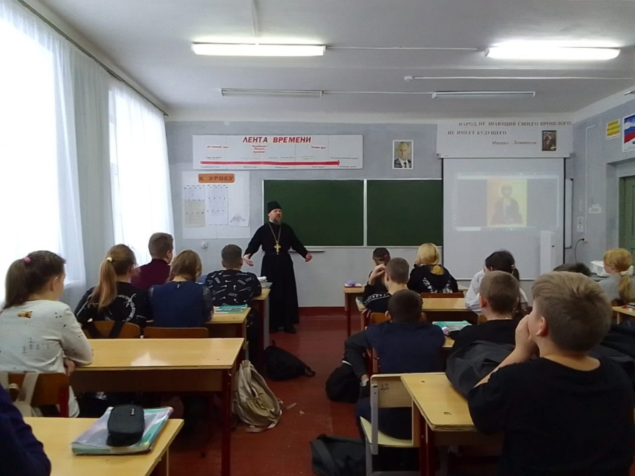 Сегодня в День Героев Отечества в нашей школе для учеников 7-х классов состоялась очередная встреча с благочинным Спировского округа отцом Сергием. Разговор был посвящён историческим личностям, значение которых трудно переоценить.