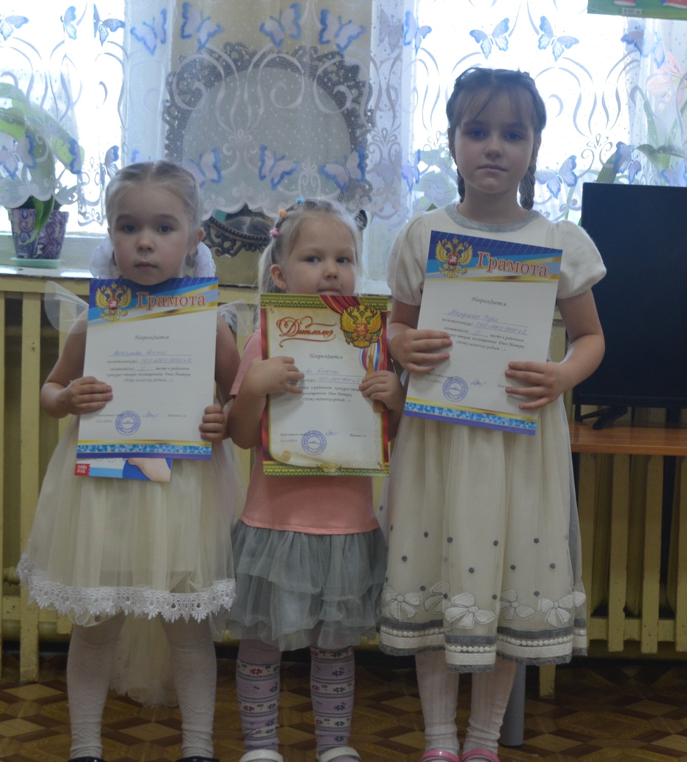 Воспитанники подразделения детского сада МОУ СОШ №2 п.Спирово Марущак Вера, Васильева Елена, Орехова Диана приняли участие в финале муниципального конкурса чтецов среди воспитанников МДОУ «Нету мамочки родней», который состоялся 22.11.2019г. на базе детского сада №4. Марущак Вера со стихотворением «О маме» М.Егоровой заняла 3-е место в номинации «Лучший чтец среди детей подготовительной группы» и Васильева Елена со стихотворением «Самая лучшая мама» В.Борисова заняла 3-е место в номинации «Лучший чтец среди детей старшей группы». | |
