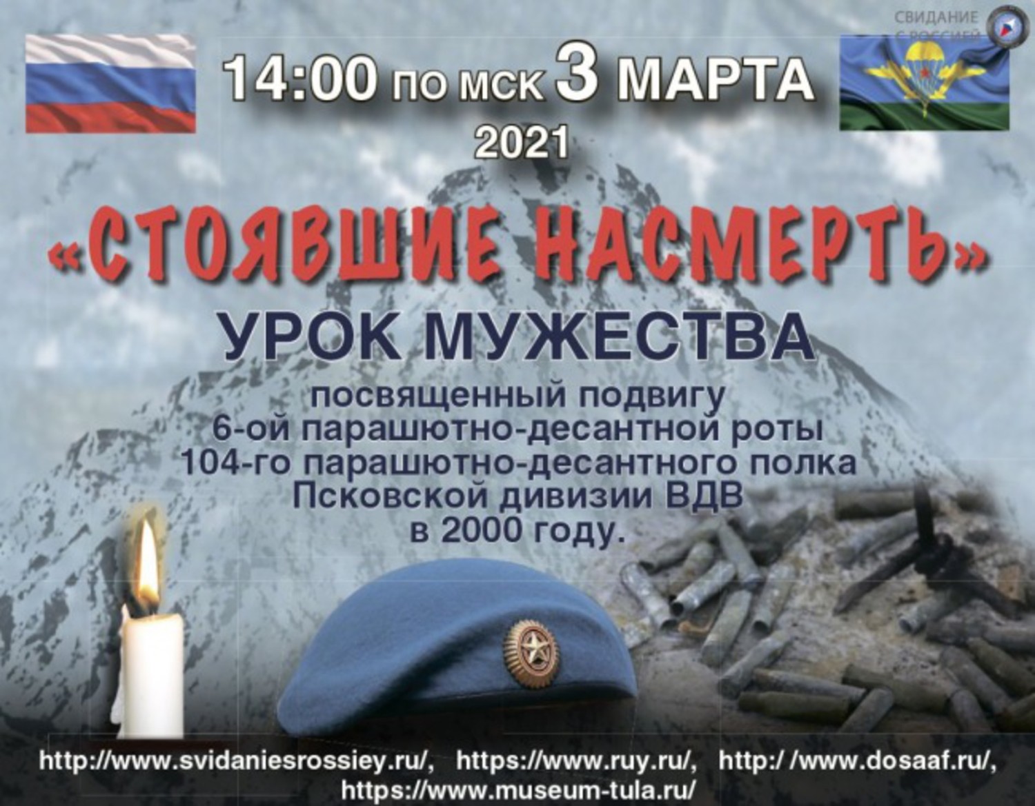 3 марта 2021 года в 14.00 часов по московскому времени состоится межрегиональный Урок Мужества «Стоявшие насмерть», посвященный подвигу 6-й роты 104-го полка 76-й Псковской дивизии ВДВ в 2000 году, не отступившему перед многократно превосходящими силами бандформирований. Урок проводится Ассоциацией «Группы «Вымпел» совместно с некоммерческим партнерством содействия развитию кино и туризма «КиТ» в рамках международного медиапроекта «Свидание с Россией». Прямая трансляции Урока пройдет на сайтах: http://www.svidaniesrossiey.ru/, https://www.ruy.ru/, http://www.dosaaf.ru/, https://www.museum-tula.ru/. | |