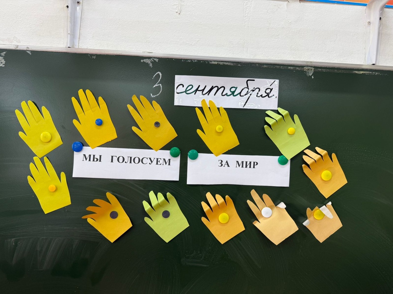 В рамках общешкольной акции «Мир на ладони» учащиеся выразили свои мысли и чувства, изобразив на бумажных ладошках мир без террора и написав искренние пожелания мира и добра.