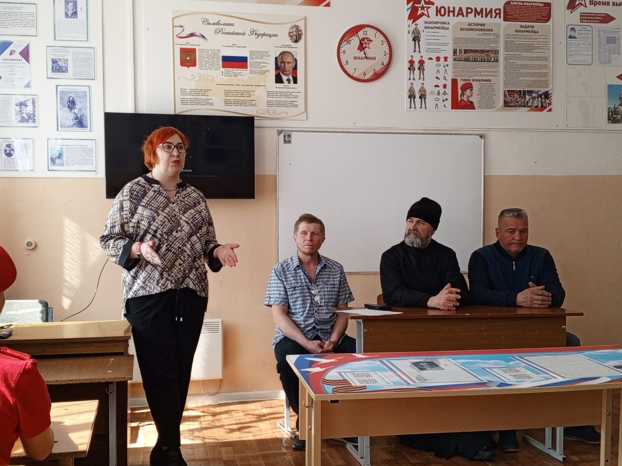 Участники специальной военной операции рассказали о современных проявлениях нацизма. Разговор состоялся серьезный, говорили о событиях, свидетелями которых были наши гости, о страданиях мирных жителей Донбасса, Курской и Белгородской областей, затронули тему неофашизма, неонацизма. Священник Михаил Ивлев призывал ребят к духовности, нравственности в своих поступках и мыслях. Гости мероприятия делали акцент на важности семьи в жизни любого человека, призывали уважать старших, бережно относиться к ближним, оберегать слабых и беззащитных. В завершении беседы пожелали подрастающему поколению любить родителей, уважать учителей, ценить те знания, которые они им дают, прислушиваться к советам взрослых, жить по - совести, гордиться своей Родиной, ее героями и не забывать историю, бережно хранить память о прошлом, чтобы иметь достойное настоящее и светлое будущее. Также отметили, что нынешние защитники Отечества являются достойными наследниками победителей в Великой Отечественной войне и твёрдо стоят на страже безопасности России.