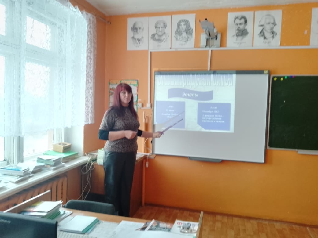 Уже по доброй традиции в нашей школе проходят мероприятия патриотической направленности. 7 февраля учитель Богданова В.А. в 6 "В" классе провела исторический час "Сталинградская битва". Приурочено мероприятие к знаменательной дате 2 февраля 1943 года, именно в тот день был ликвидирован противник, а город Сталинград освобождён. | |