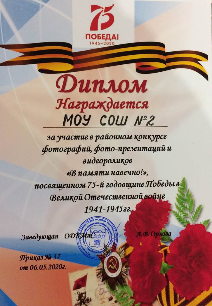 В апреле ученики нашей школы приняли участие в районном конкурсе фотографий, презентаций и видео, посвященном 75-й годовщине Победы в Великой Отечественной войне 1941-1945 гг. "В памяти навечно!" Мы поздравляем победителей и призеров в номинации «Современная фотография в военном стиле» - 2 место занял Никифоров Е., ученик 1 «Б» класса. В номинации «Фотографии на патриотическую тему» - 1 место у Шабанова Д., ученика 10 класса. А также дипломами лауреатов в специальной номинации «Фото-история» награждены: Алексеев А., ученик 4 «Б» класса, Слепнев А., ученик 4 «Б» класса и Петров Д., ученик 2 «Б» класса. Поздравляем победителей и призеров! | |