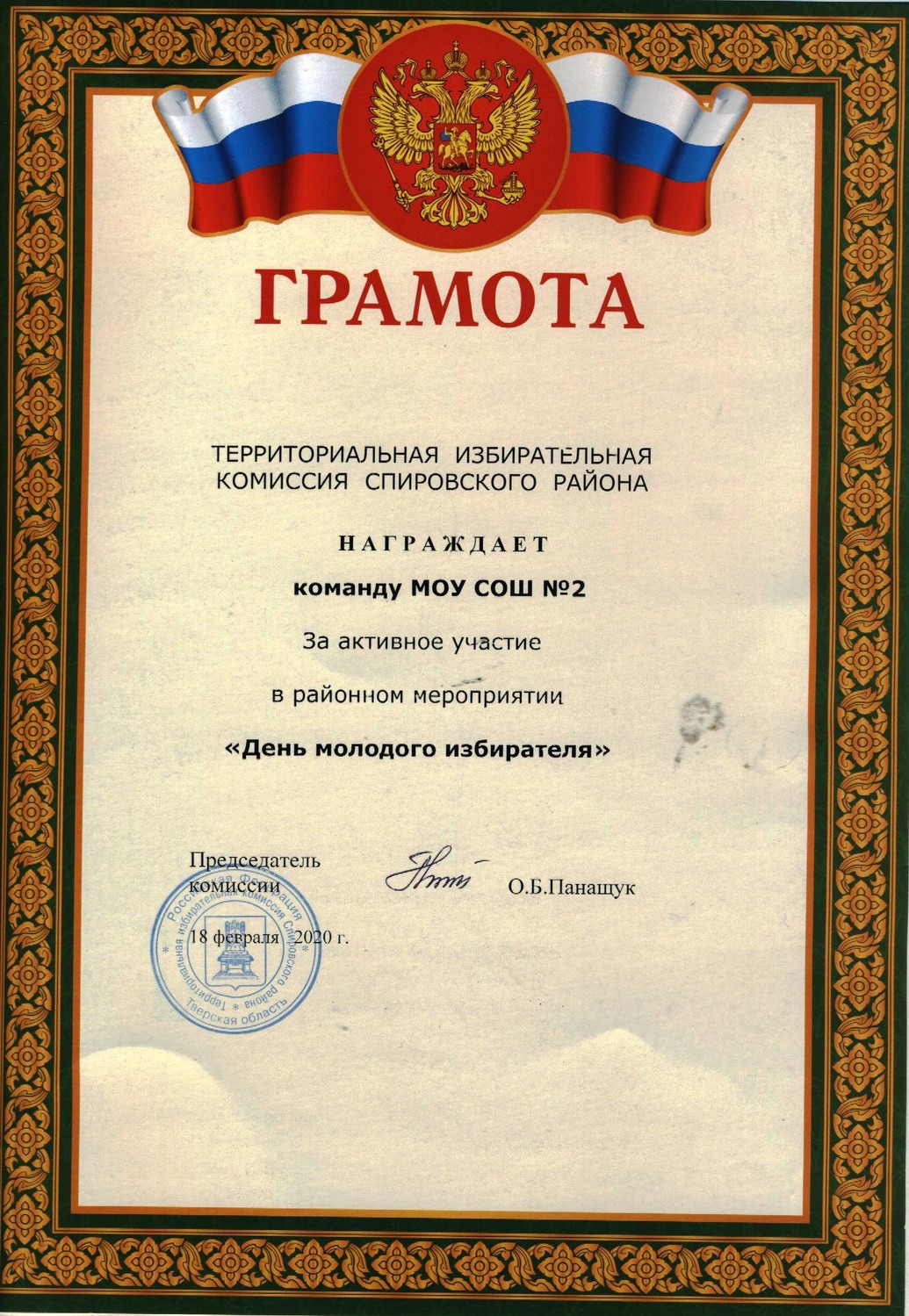 Ежегодно в феврале в нашей стране проходят мероприятия, приуроченные ко Дню молодого избирателя. 18 февраля 2020 года команда 8 «Б» класса нашей школы приняла участие в квест-игре «Выборы – это важно!» С приветственным словом к командам обратилась Панащук О. Б., председатель ТИК, она обратила внимание ребят на важность проведения и участия в выборах, рассказала об особенностях проведения выборной кампании. Затем команды школ Спировского района соревновались в различных конкурсах: «Народная мудрость», «Юридическая консультация», «Споемте, друзья» и т.д. По итогам проведенной квест-игры команды были награждены грамотами и памятными сувенирами. | |