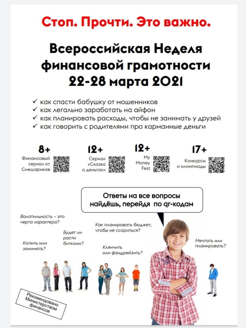 С 22 по 28 марта 2021 года проводится Всероссийская неделя финансовой грамотности для детей и молодежи. Целью проведения Недели является содействие повышению уровня информированности детей и молодежи по вопросам личных финансов и развитие навыков грамотного решения финансовых вопросов. Центром финансовой грамотности Научно-исследовательского финансового института Министерства финансов Российской Федерации (далее – Центром) будут проведены мероприятия Недели в дистанционном формате в сети Интернет в период с 22 по 28 марта 2021 года. Основной Интернет-площадкой мероприятий Недели является сайт http://вашифинансы.рф , на котором Центром размещаются ссылки, материалы и иная информация о Неделе. Также Центром формируется общероссийский календарь Недели с датами проведения планируемых мероприятий в субъектах Российской Федерации. | |